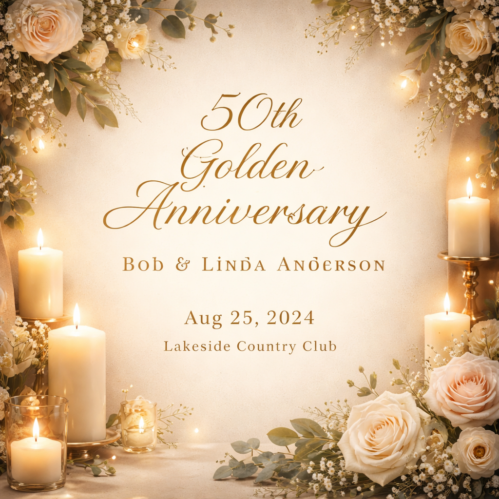 Fifty years of love, laughter, and adventure! Please join the Anderson family as we celebrate Bob and Linda's Golden Wedding Anniversary. Your presence is the only gift requested, but memories and well-wishes are always welcome. Formal attire appreciated.