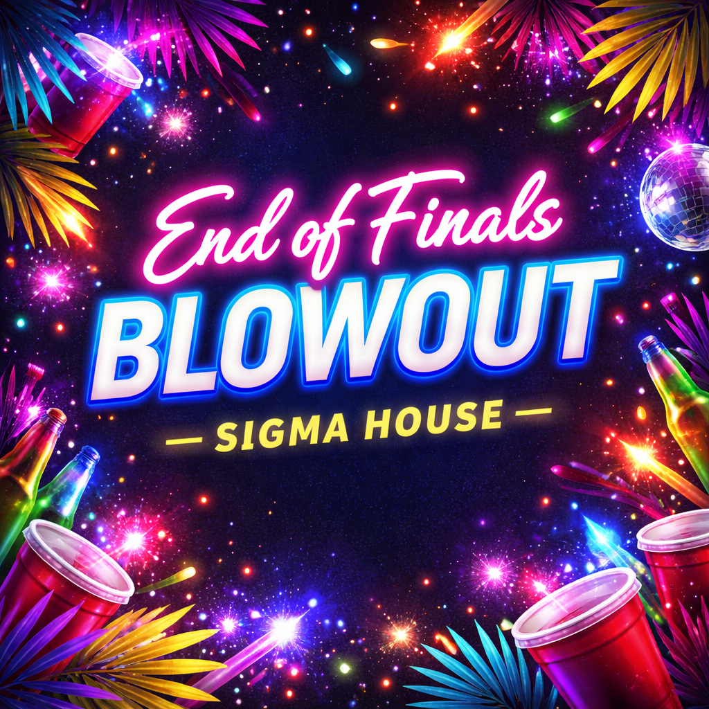 Finals are DONE and it's time to celebrate! Join us at the Sigma house for the biggest end-of-semester party of the year. We've got a DJ, a dance floor in the basement, a rooftop chill zone, and enough snacks and drinks to fuel the celebration. Theme: 'Anything But a Cup' — get creative with your drinkware (think frisbees, watering cans, boots). No cover if you RSVP, $5 at the door. Bring your student ID. Let's send this semester off right!