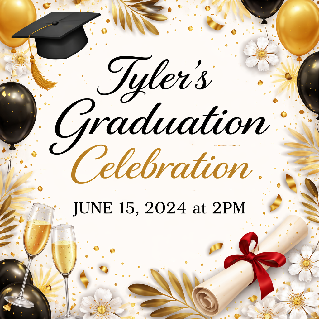 After four years of hard work, Tyler is officially a college graduate! Join the Williams family as we celebrate Tyler's Bachelor's degree in Computer Science from State University. Open house format - stop by anytime between 2-7pm. Food, drinks, and proud parents provided!
