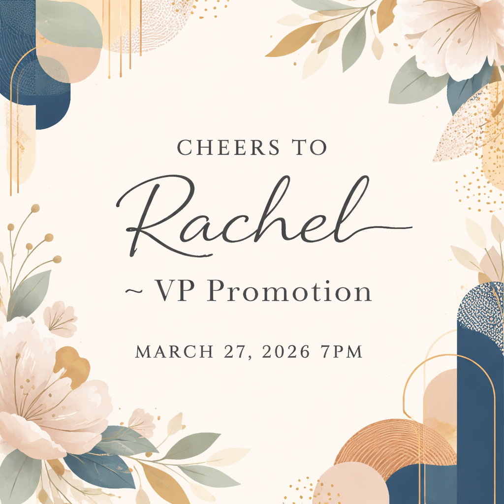 After 8 incredible years of dedication and leadership, Rachel Torres has been promoted to Vice President! Let's celebrate this well-deserved milestone with an evening of great food, drinks, and company. From late nights on the Henderson deal to mentoring half the team, Rachel has earned every bit of this achievement. Join colleagues, friends, and family to toast to her success and the exciting chapter ahead. Please RSVP so we can plan this night right!