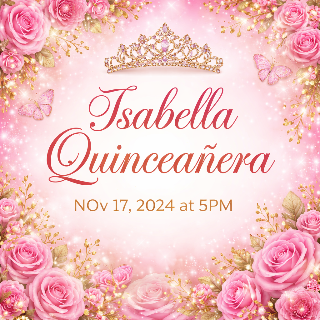 La familia Rodriguez les invita cordialmente a celebrar los quince años de nuestra princesa Isabella. Join us for a beautiful celebration honoring Isabella's transition from childhood to young womanhood, featuring a traditional ceremony, dinner, and dancing. Formal attire requested.